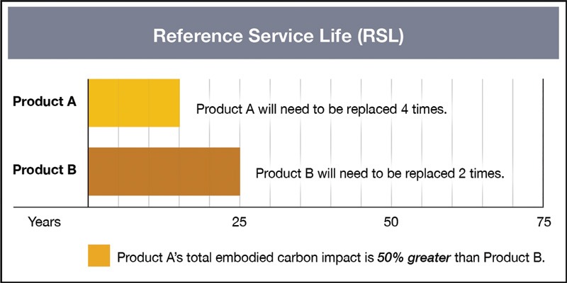 Even if product A’s embodied carbon is 10 per cent less than product B’s, during the building’s RSL, product A’s total embodied carbon impact will be 50 per cent greater than product B’s because product A needs to be replaced more often. Even with a 15 per cent differential, product A’s total impact will be 41 per cent greater than product B’s over the building’s RSL.